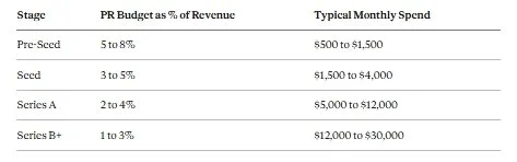 PR should represent 10 to 20% of your total marketing budget. As a percentage of funding raised, venture-backed startups typically allocate 3 to 5% of a round to PR around a launch or announcement. As a percentage of revenue, seed-stage startups generally spend 3 to 5% on PR, tapering to 1 to 3% at Series B and beyond as overall revenue grows.