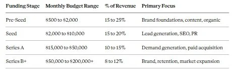 Seed-stage startups should plan to spend 15 to 20% of revenue on marketing, roughly $2,000 to $10,000 per month, while Series A companies typically spend 10 to 15%, or $15,000 to $50,000 per month.